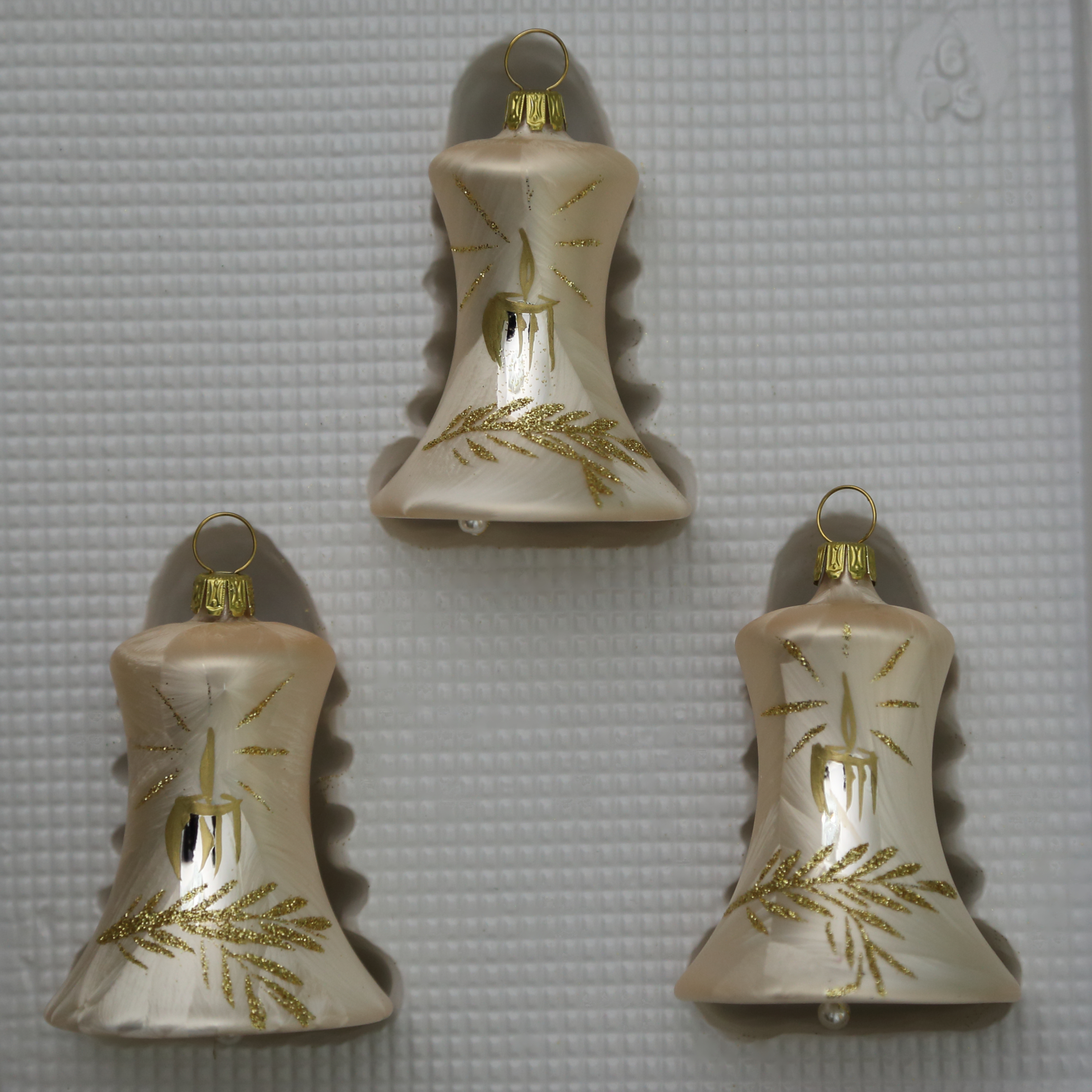 Glocken klein mit Schlägel Eislack champagner mit Kerzendekor, 3 Stück, d 5cm