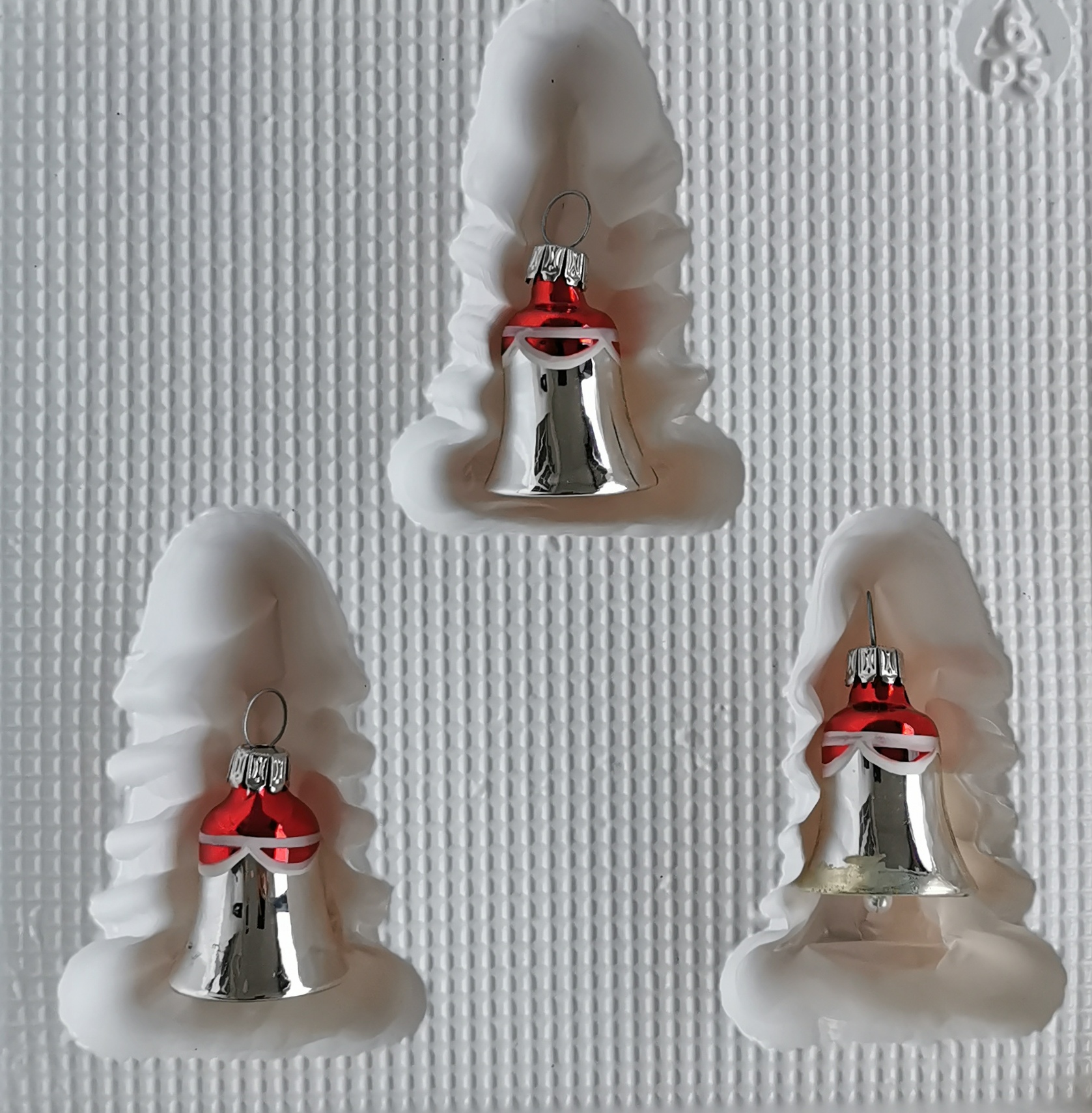 Glöckchen klein mit Schlägel silber rot weiß, 3 Stück d 2,5cm, L ca. 4cm, 2.Wahl