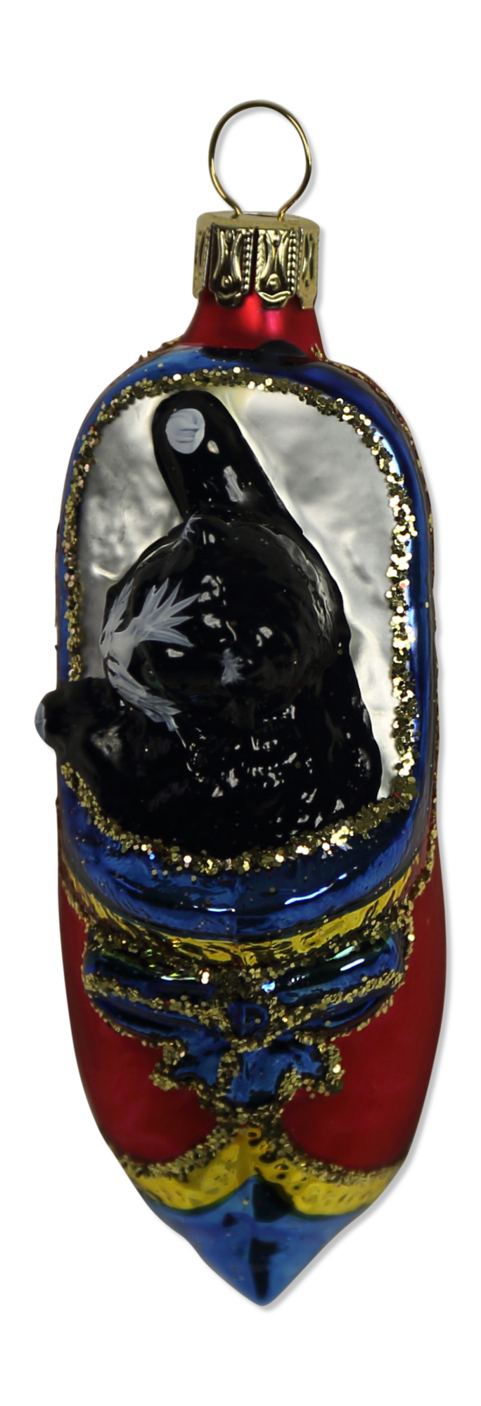 Katze im Schuh rot/blau, L 9cm, Christbaumschmuck, Weihnachtsbaumschmuck aus Glas