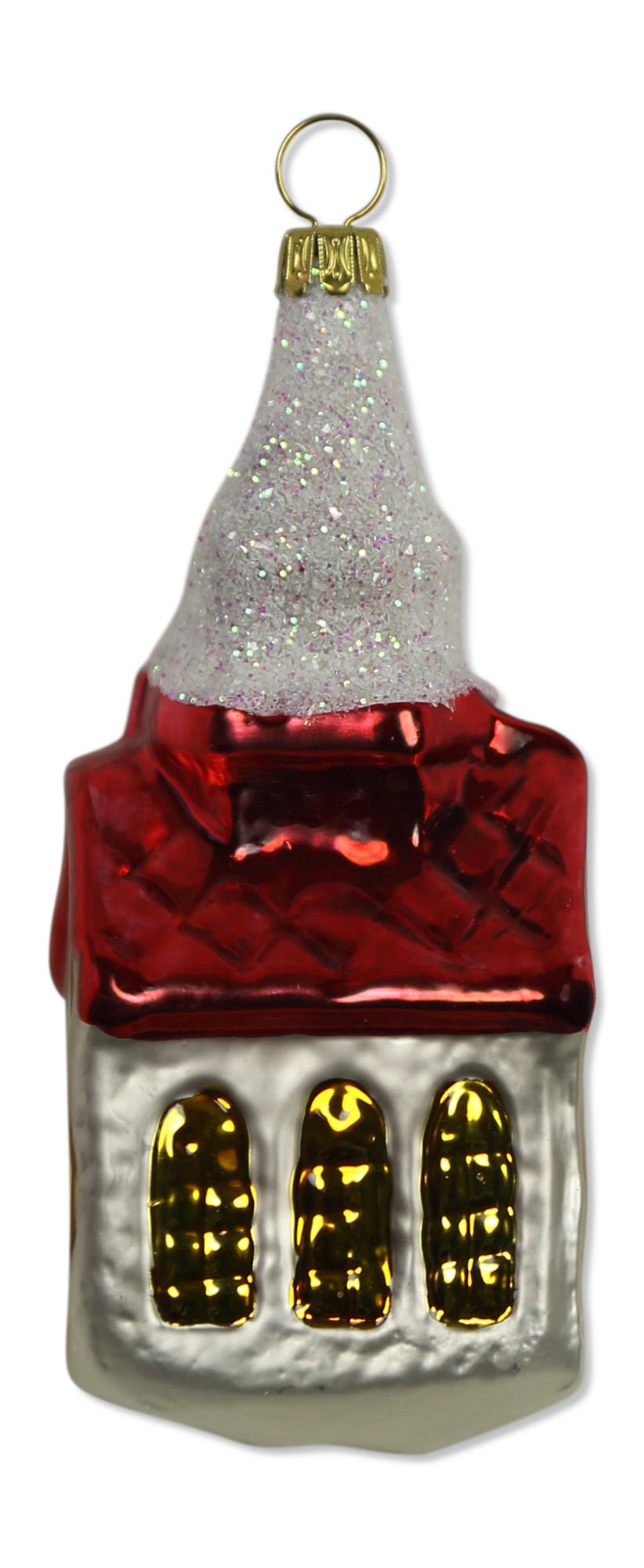 Kirche weiß matt/rot, L 10cm, Christbaumschmuck, Weihnachtsbaumschmuck aus Glas