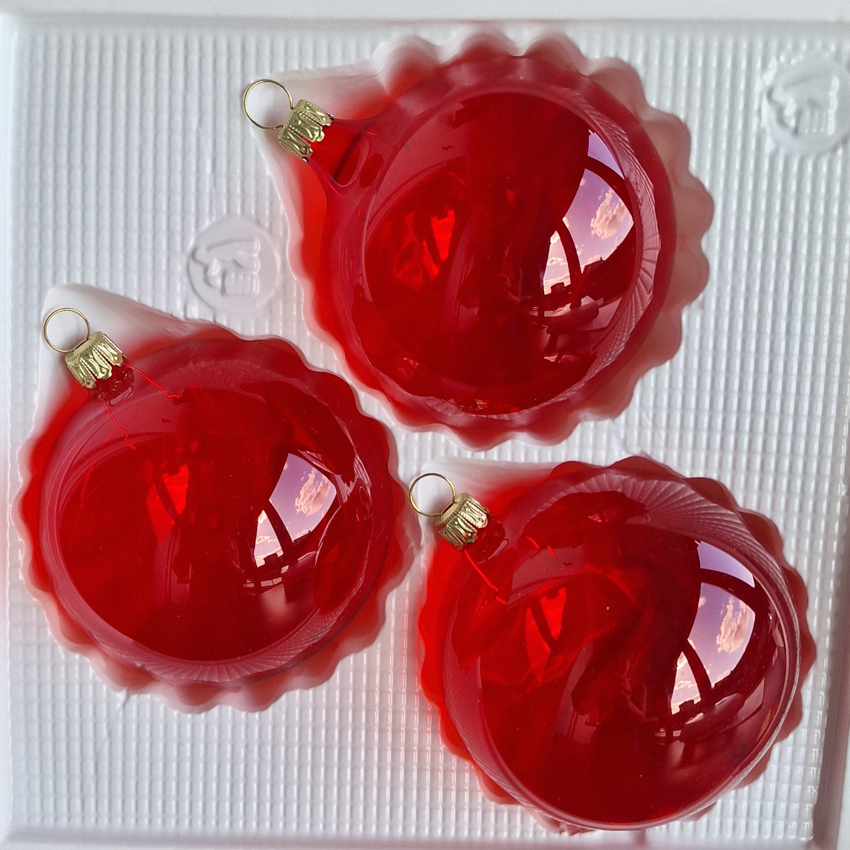 Kugeln rot klarglas mit Schmuckhütchen, 3 Stück, d 8cm, , 2. Wahl
