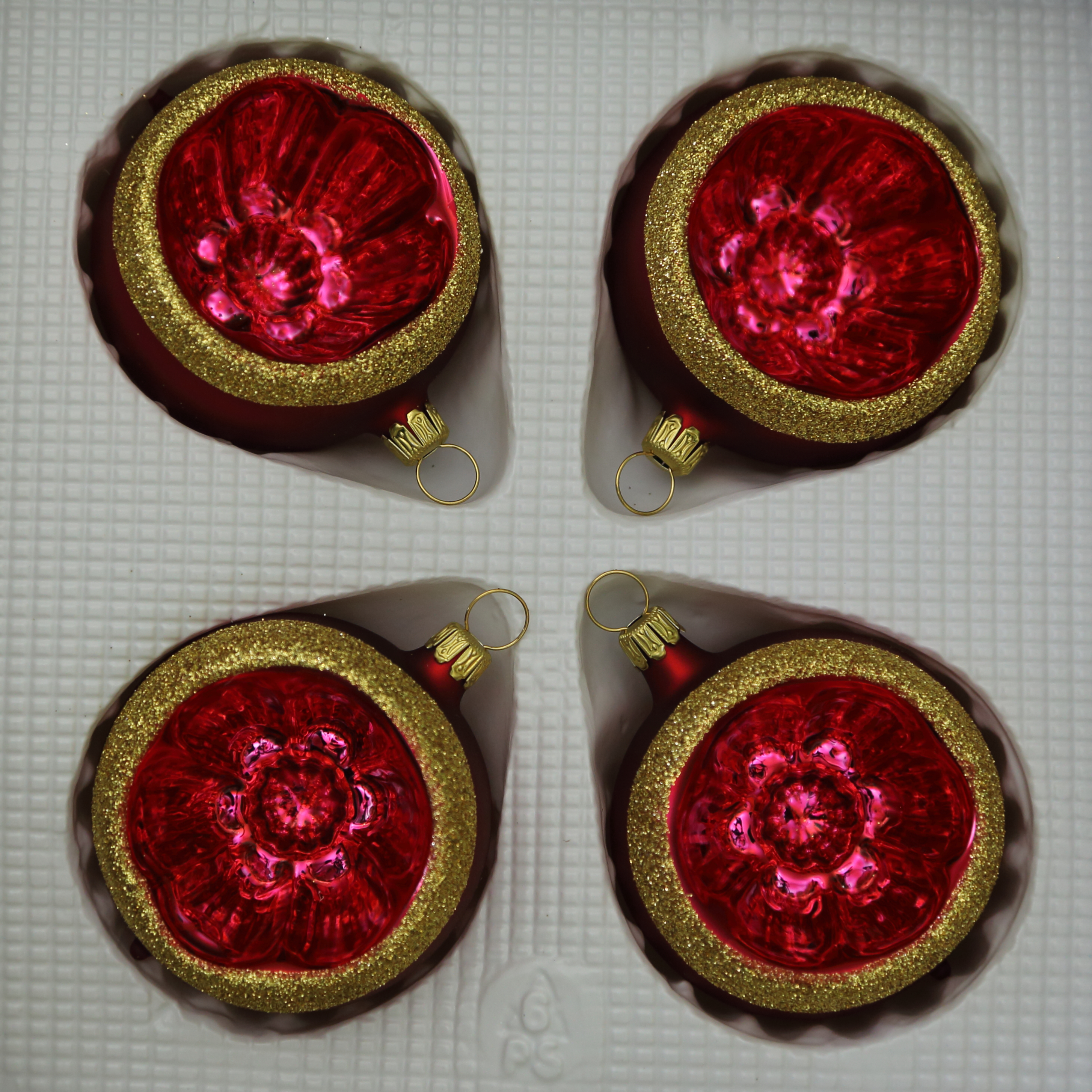 Kugeln mit Einstich dunkelrot matt mit Dekor, 4 Stück Reflexe, d 6cm