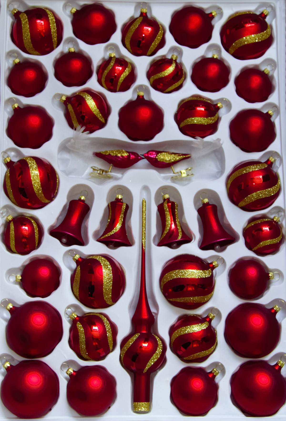 Sortiment 39 Teile, bestehend aus 32 Kugeln (10xd5cm/12xd6cm/10xd7cm), 4 Glocken mit Schlägel, 2 Vögel, 1 Spitze. Das Sortiment ist ausreichend für einen Baum von ca. 1.20 m Höhe. Christbaumschmuck, Weihnachtsbaumschmuck aus Glas
