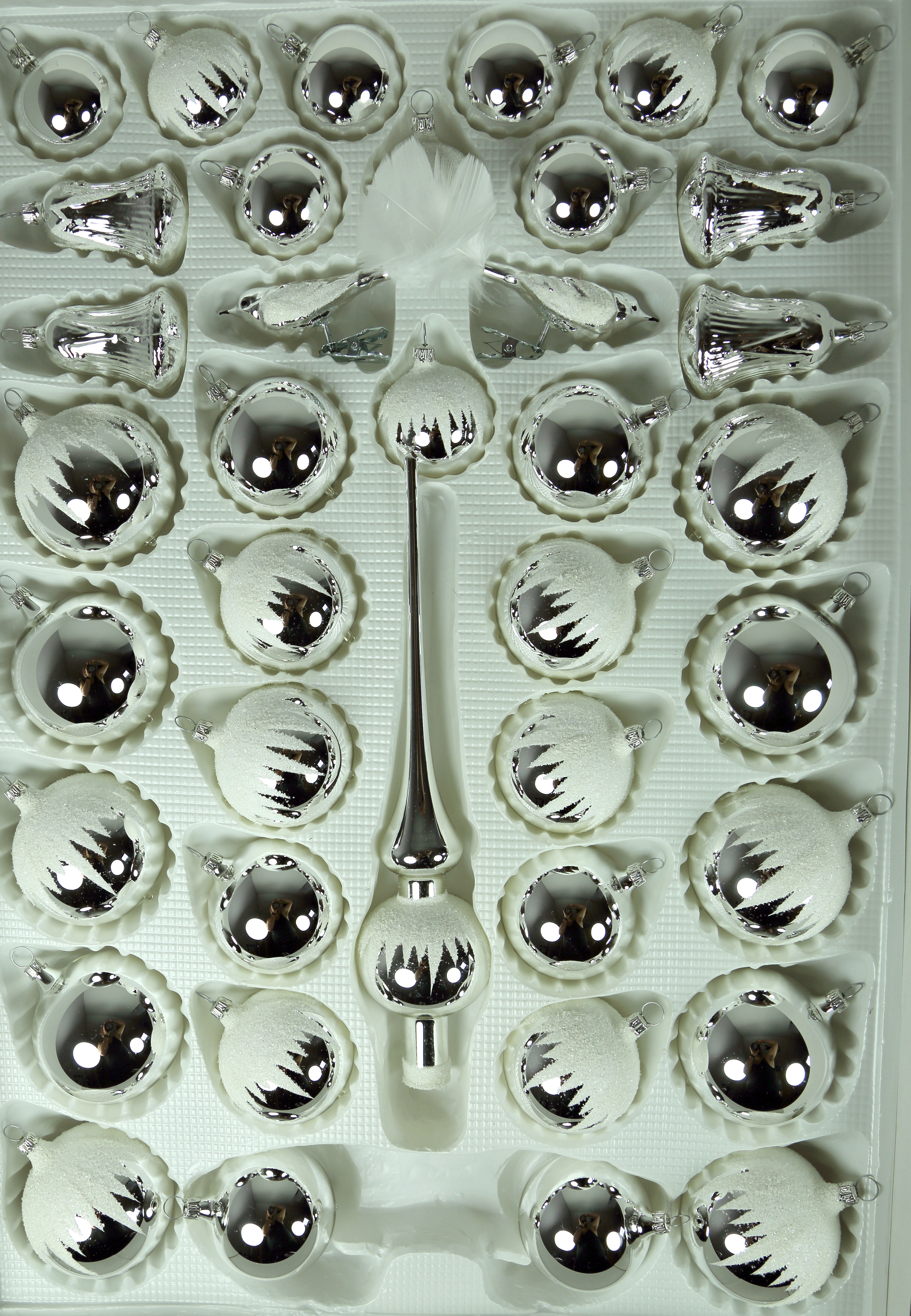 Sortiment 39 Teile, bestehend aus 32 Kugeln (10xd5cm/12xd6cm/10xd7cm), 4 Glocken mit Schlägel, 2 Vögel, 1 Spitze. Das Sortiment ist ausreichend für einen Baum von ca. 1.20 m Höhe. Christbaumschmuck, Weihnachtsbaumschmuck aus Glas