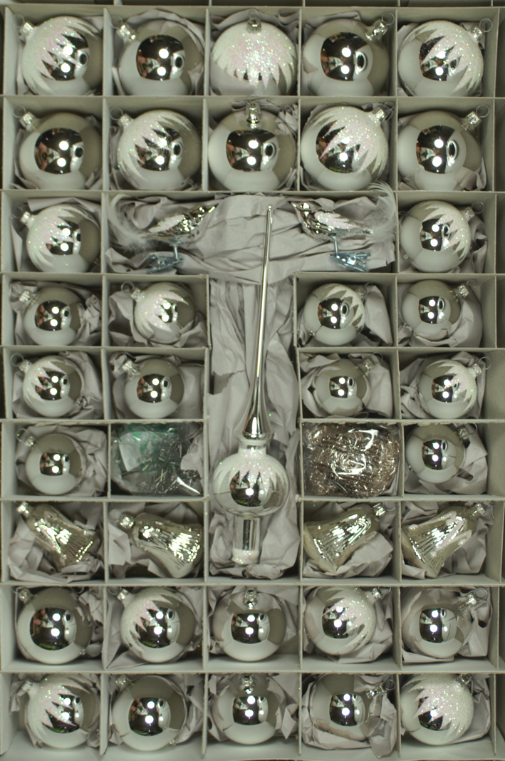 Sortiment 41 Teile, bestehend aus 32 Kugeln (10xd5cm/12xd6cm/10xd7cm), 4 Formglocken, 2 Vögel, 1 Spitze, 1 Päckchen Schnellaufhänger (50 Stück), 15g Feenhaar metall. Das Sortiment ist ausreichend für einen Baum von ca. 1.20 m Höhe. Christbaumschmuck, Weihnachtsbaumschmuck aus Glas